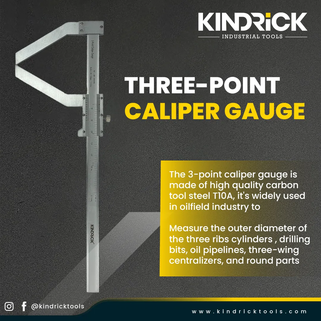 • 1The 3-point caliper gauge is made of high quality carbon tool steel T10A, it’s widely used in oilfield industry to Measure the outer diameter of the three ribs cylinders , drilling bits, oil pipelines, three-wing centralizers, and round parts